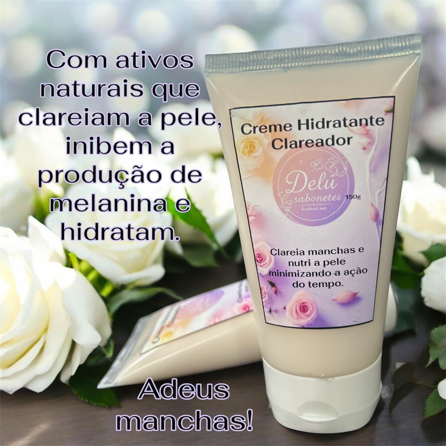 Creme hidratante artesanal com ativos que clareiam a pele, inibem a formação de novas manchas, hidratam e perfumam com a maravilhosa essência de rosas. 150g.