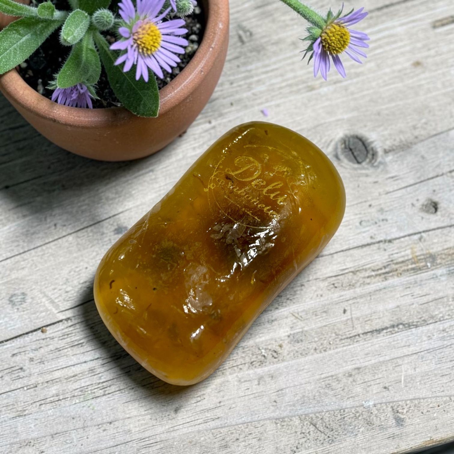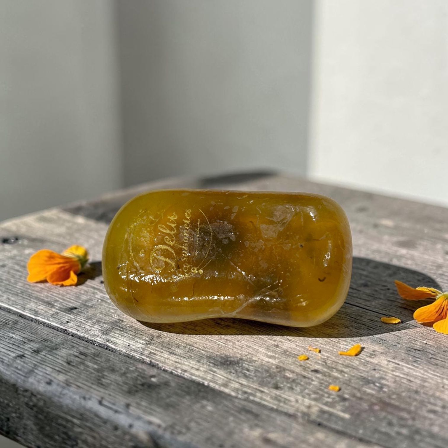 Sabonete artesanal com fragrância e flor de calêndula e óleo de amêndoas doce. Proporciona efeito anti-inflamatório, cicatrizante e calmante. Ideal para peles sensíveis! Auxilia também no combate e prevenção de estrias. 85g