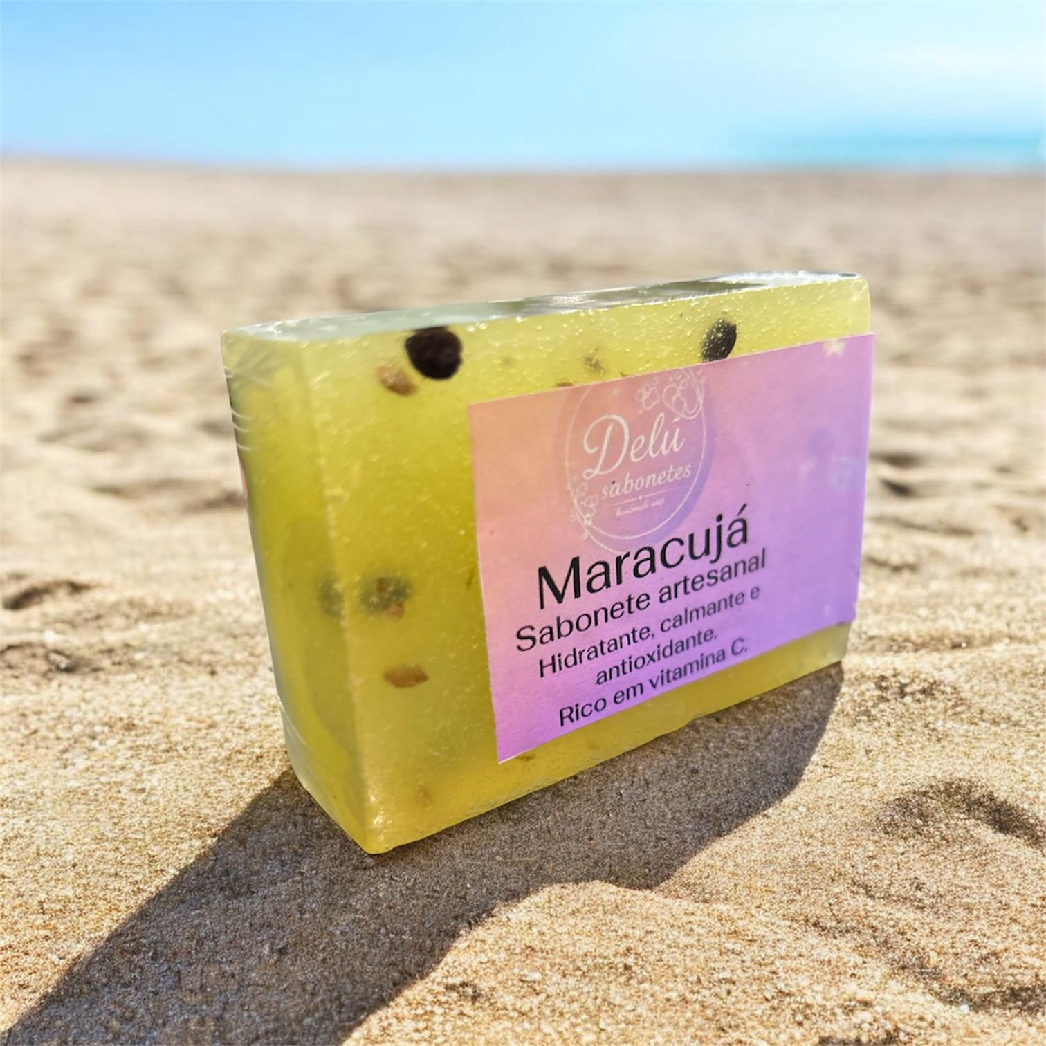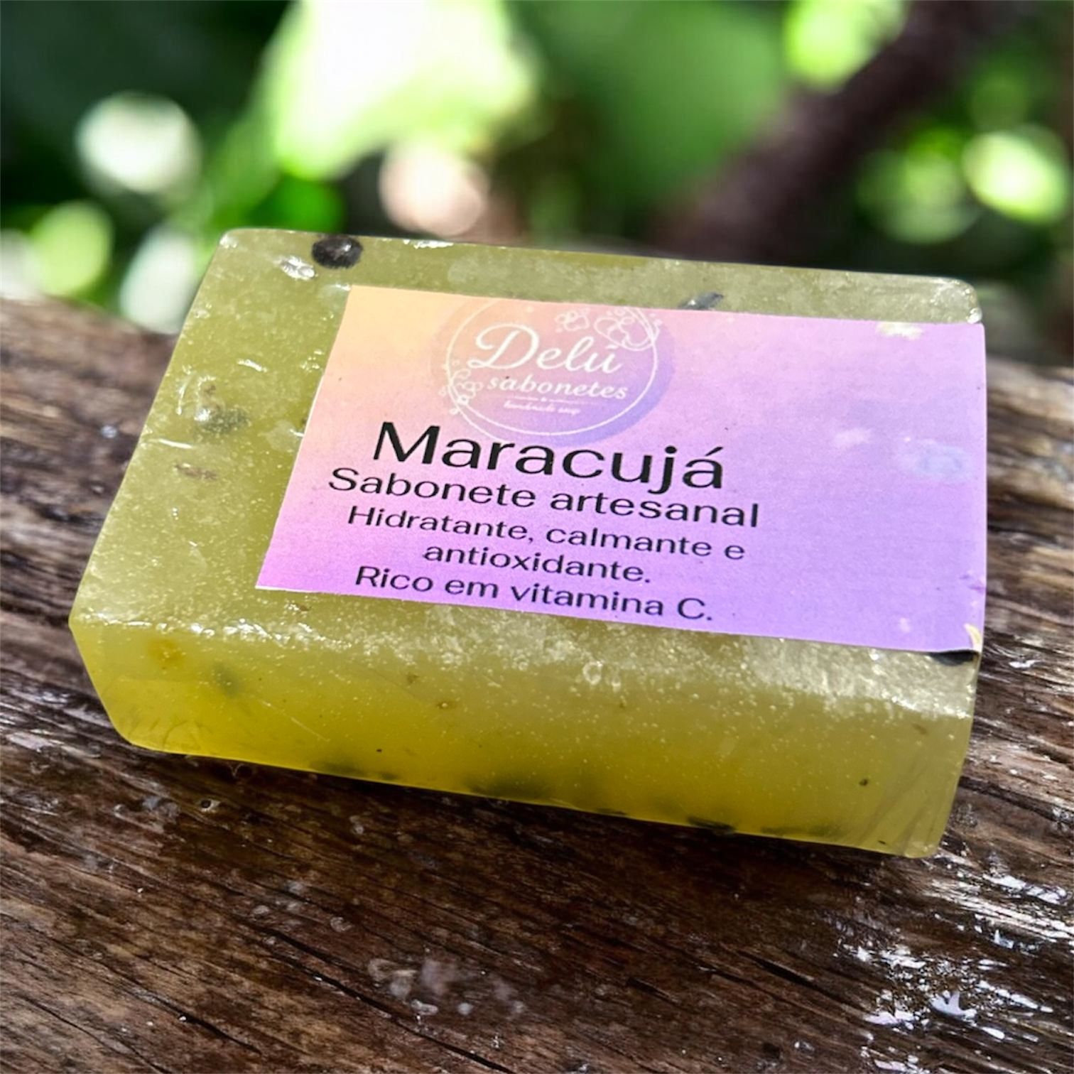 Sabonete artesanal em barra com óleo vegetal de coco, manteiga de Karite, essência e sementes de maracujá que vai deixar a sua pele mais hidratada. 110g.